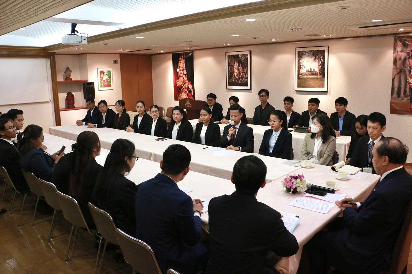 ក្នុងឱកាសនោះ តំណាងនិស្សិតកម្ពុជាដែលបានបញ្ចប់ការសិក្សាដោយជោគជ័យ បានឡើងថ្លែងអំណរគុណ ជូនចំពោះ ឯកឧត្តមឯកអគ្គរាជទូត និងបានបង្ហាញអំពីចំណាប់អារម្មណ៍និងបទពិសោធន៍សិក្សារបស់ខ្លួននៅក្នុងប្រទេសជប៉ុនរយៈពេល២ឆ្នាំកន្លងមកនេះ ព្រមទាំងបានប្តេជ្ញាថានឹងនាំយកនូវជំនាញ បទពិសោធន៍ និងគំនិតច្នៃប្រឌិតថ្មីៗ ដែលបានពីការសិក្សារៀនសូត្រ និងការស្រាវជ្រាវនៅប្រទេសជប៉ុន ទៅអនុវត្ត និងចែករំលែកនៅតាមក្រសួងស្ថាប័នរៀងៗខ្លួន។